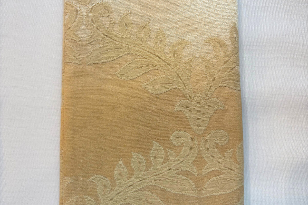 Beige Jacquard fabric, slightly polished, with a diamond leaf pattern. Elegant and formal. Also available in 132″ round.