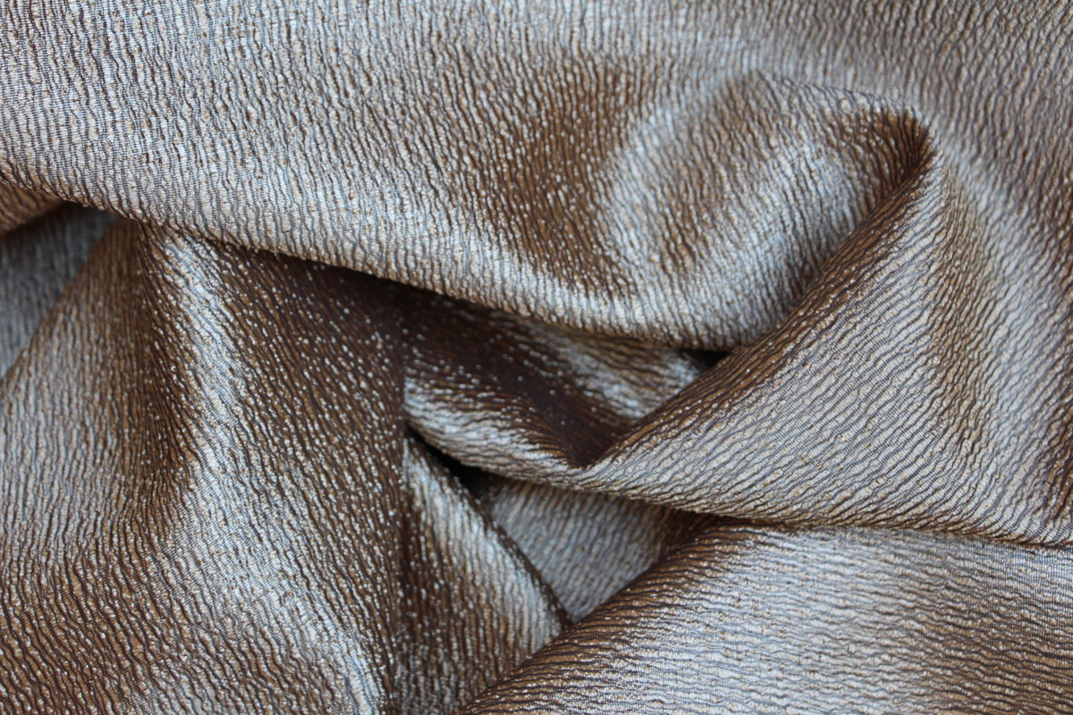This lightly crinkled fabric is striated with a black design reminiscent of tree bark. Slightly polished with a textured appeal.