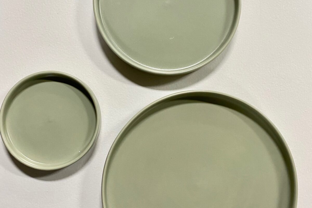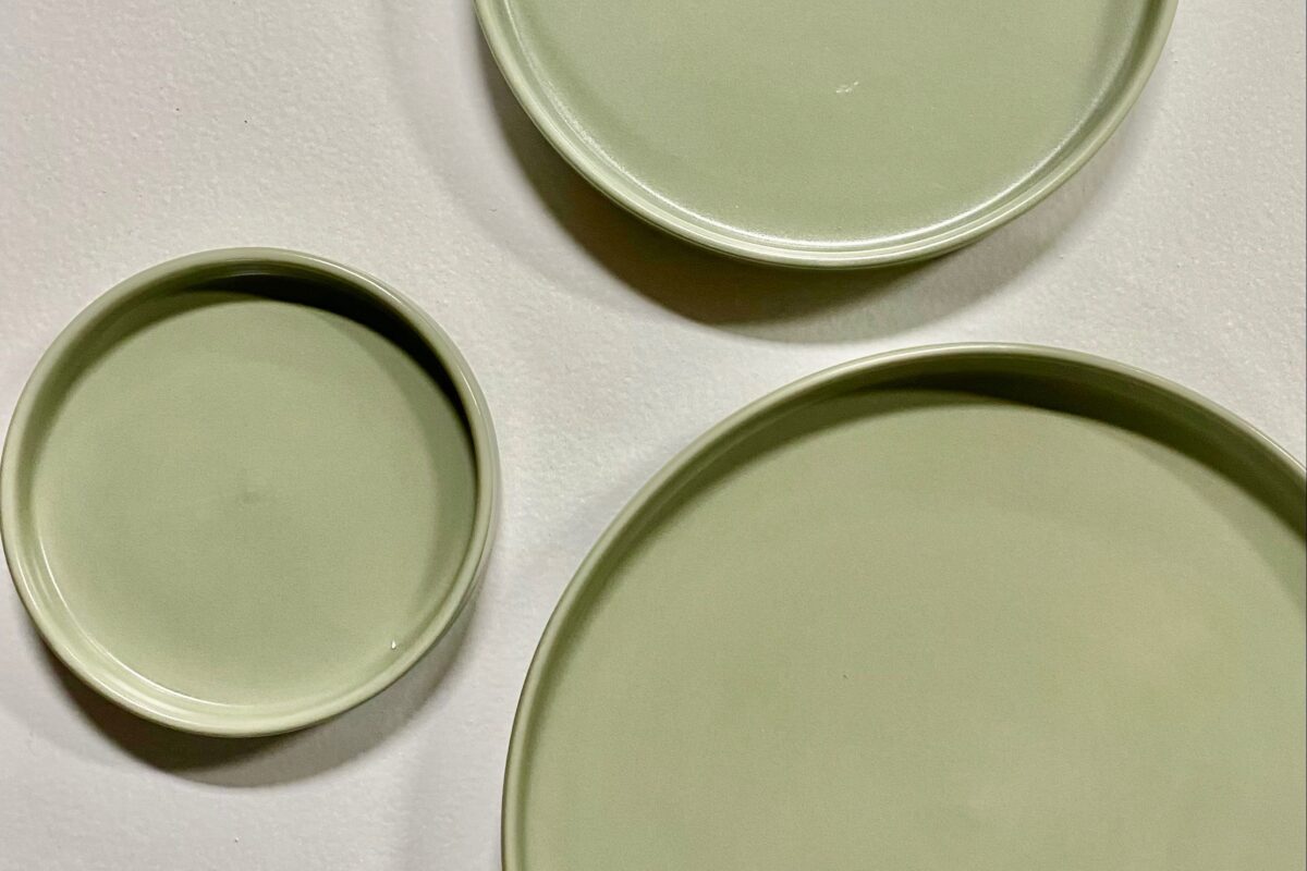 Earthy, Sage green, deep rim plates with a stoneware appeal. Both modern and artisanal.