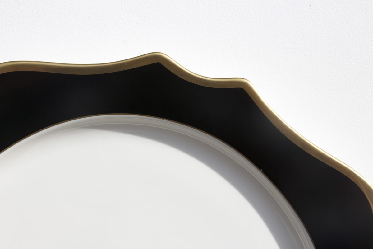 Scalloped plate with a wide black rim trimmed in 1/4″ brushed gold.