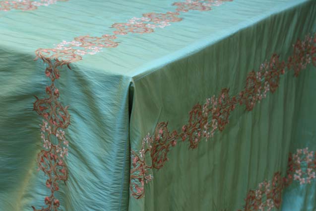 Green taffeta embroidered with an ornate bronze, antique gold and cream pattern; formal and elegant.