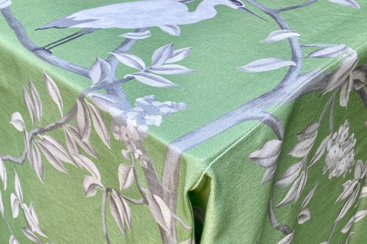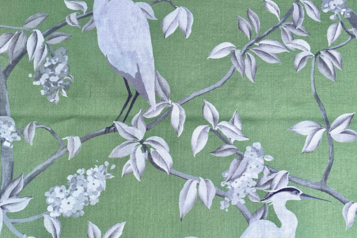 Stately long legged Egrets perched over a thick, green, linen blend fabric.