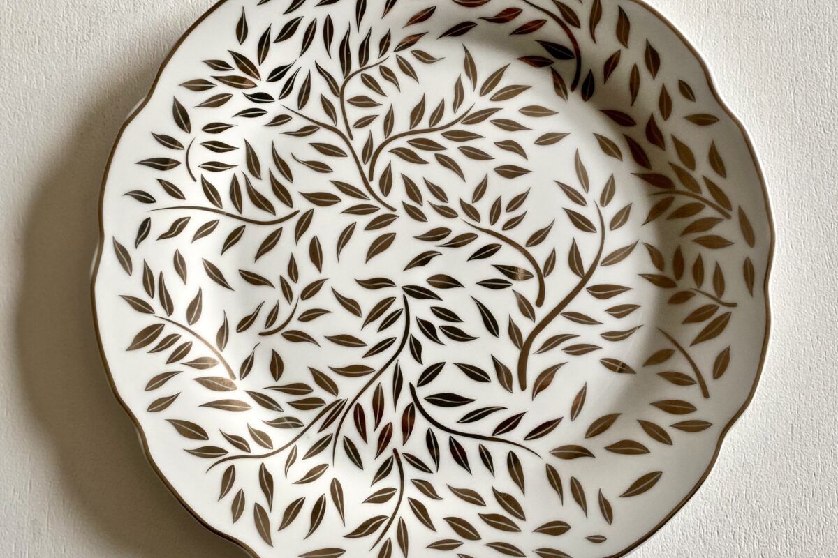Modern leaf design over a scalloped Porcelain Plate. Great Show Plate at the Dinner Table.