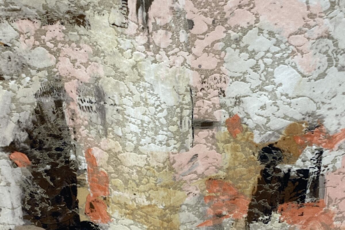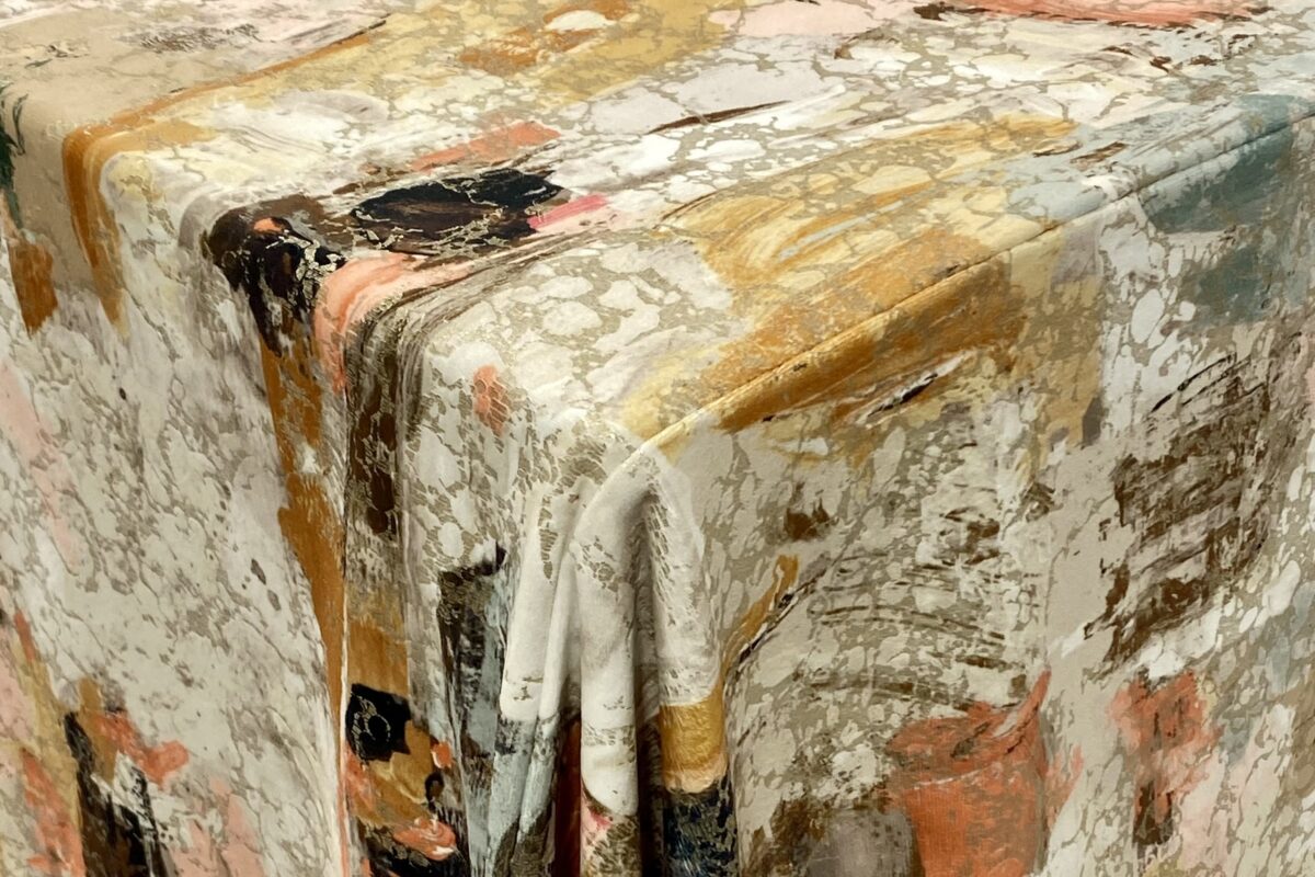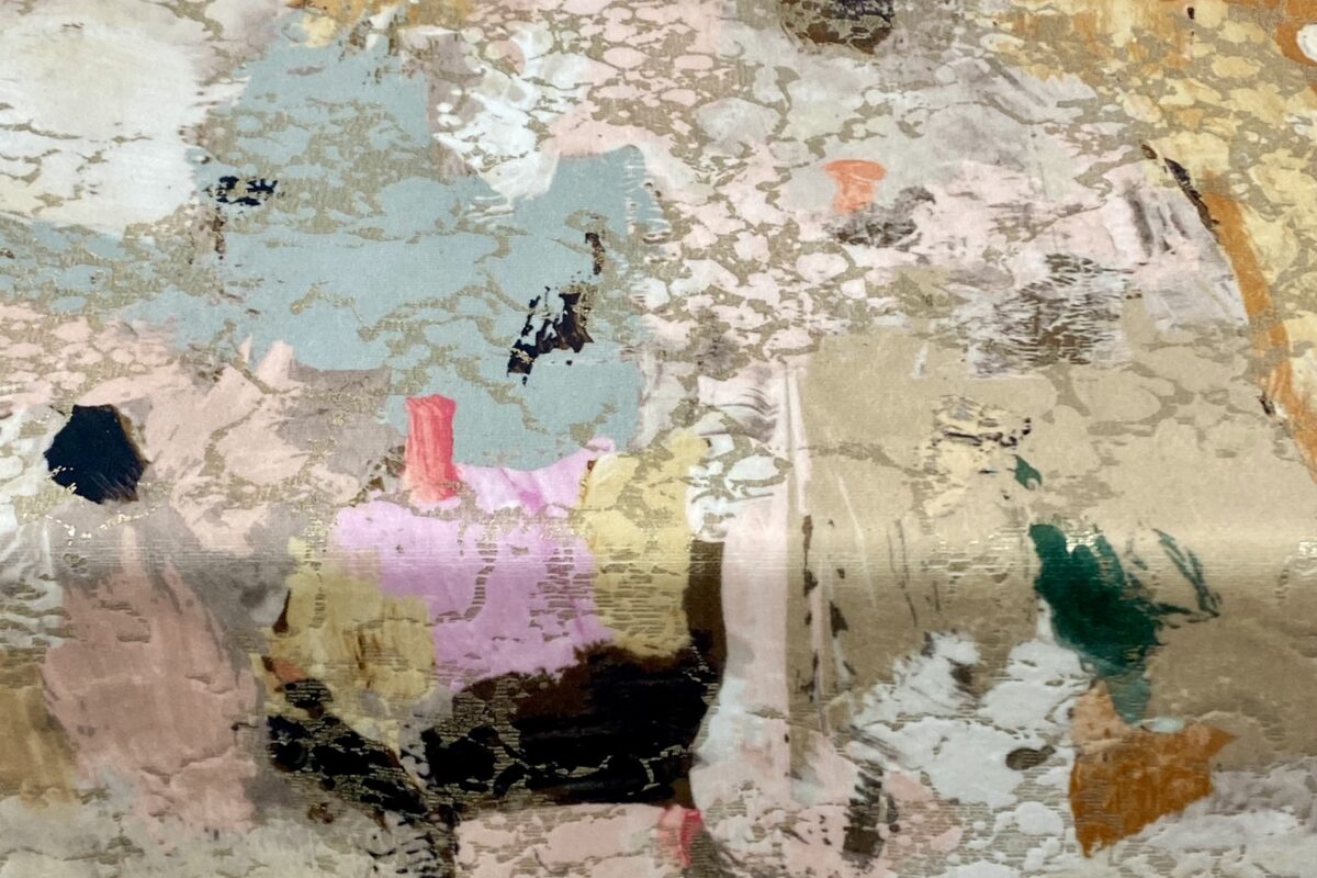 A medley of warm colors “splashed” on smooth velvet and dusted with a bit of gold, creating a textured 3-D effect.Combines easily with a variety of solid colors.